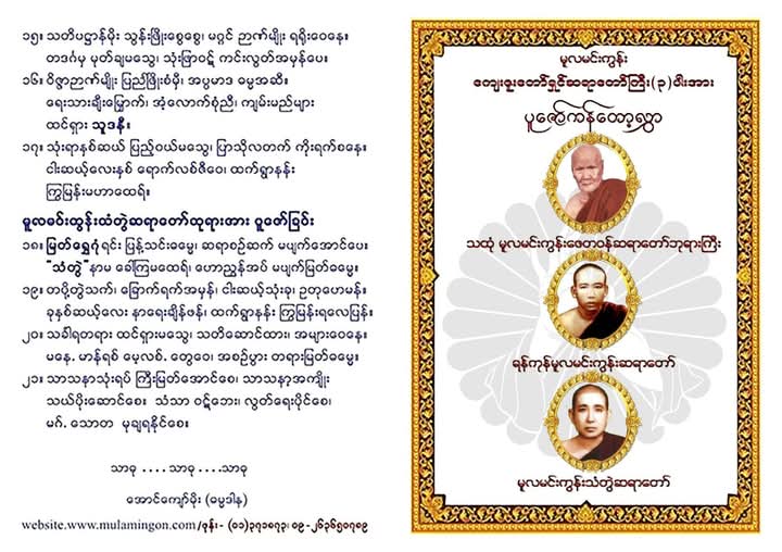 (၂၆-၁-၂၀၂၅) ယ္ခုလာမည့်တနင်္ဂနွေနေ့တွင် (၆၆-ကြိမ်မြောက်)ကျေးဇူးရှင် မူလမင်းကွန်းဆရာတော်ဘုရားကြီး ၃-ပါးပူဇော်ပွဲ နံနက် ၉:၀၀နာရီတွင်ကျင်းပပါမည်။